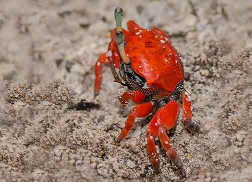 If you have ever walked either on the seaward side or landward side of mangroves or close to tropical muddy beaches as the tide goes out, you can't have failed to notice small, often colourful crabs starting to emerge from their burrows. They are very shy and retreat with lightning speed into their burrows at the first sign of danger. If you very still and patient they will emerge in numbers and miniature spectacle of nature will start.