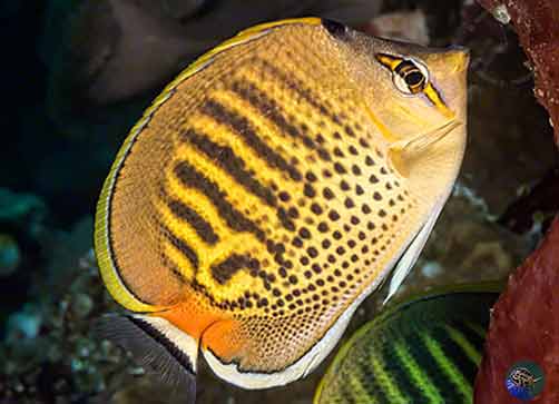 A very distinctive chevron pattern or very strong stripes characterise these species. Chaetodon flavissimus is fairly similar to C. trifascialis. C flavissimus is as long as high, red-brown and has a yellow line at the base of the tail fin, C. trifascialis is longer than high , has a distinct black stripe through the eye and no line at the base of the tail fin.