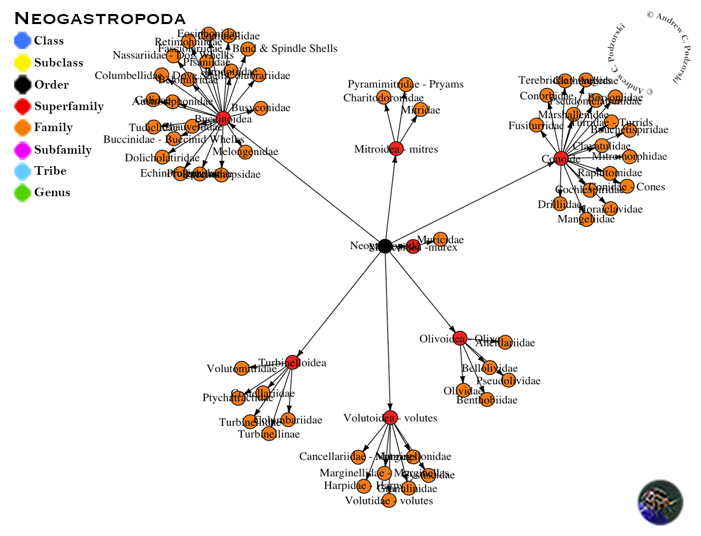 There are about 16 000 species in this Sub-class of marine shells. It contains many well known groups such as cones, augers, harps, murex, olives, volutes and whelks. Their internal anatomy relates them, even if the shells look widely different.