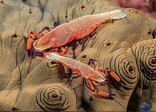 Thaumastocaris streptopus hides deep in tube sponges, and is cryptically coloured. The best time to see them is at night when the venture to entrance of the sponge to forage on teh surface. Stegopontonia commensalis takes its home up between the protective spinse of long-spined sea urchins,