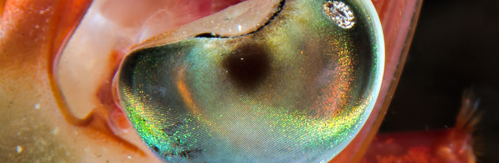 The photos clearly show their extraordinary eyes. These can be moved independantly, and are sensitive to a very wide range of light (including polarised light), making them the most complex eyes in the animal kingdom. Their acute vision is needed for hunting, fighting and recognising the detail of thier surroundings.