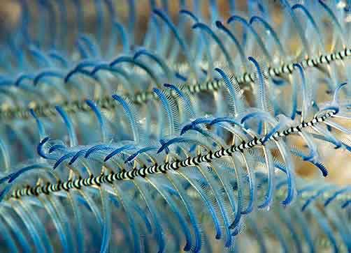 Hedgehog Skins, the literal translation of Echinoderms, are the subject of the reef-stories here. The some 7000 species of Feather-Stars, Basket Stars, Starfish, Sea Urchins, Sand Dollars and Sea Cucumbers are found throughout the oceans. They are ecologically important in reefs, as predators, cleaners and as feathery hosts for entire communites of other animals as described in the feather-star party story
