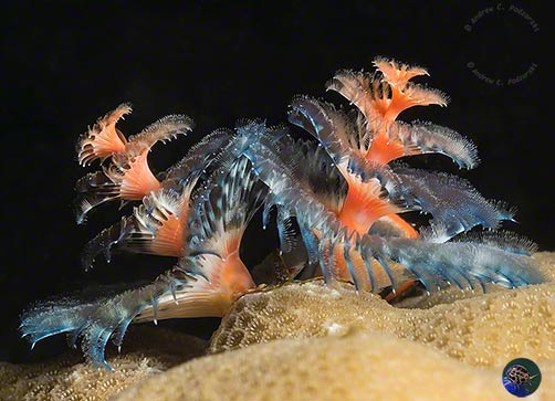 All the amazing coloured species here filter their food from the water with a complex network of cilia on their finely branched "Christmas Trees" or "Feather Dusters". Their fossils are the earliest known from the Jurassic.